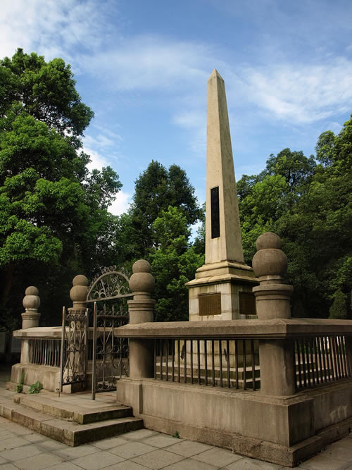 | 在岳麓山上。墓由三層臺階百余級踏步導入,墓碑為一四棱形的整塊4乳白色巖石琢成,全高約10米,因地處岳麓山高峰開闊處,顯得格外聳拔、挺秀、眺望湘江江,長沙景物盡入眼底。黃光(1874—1916),朱名軫,號杞園,又號克強,湖南善化(今長沙)人,辛亥革命重要領(lǐng)導人,史有“孫黃”之稱。1904年組織華興會,翌年8月與孫中山、章太炎等人組織中國同盟會,曾生動并領(lǐng)導欽州、廉州(治今廣西合浦)、鎮(zhèn)獻花(今友誼關(guān))、河口、廣州等地區(qū)反清戰(zhàn)役起義,任民軍戰(zhàn)時總司令。南京臨時政府成立,任陸軍總長。袁世凱稱帝后,任討袁軍總司令。1914年赴美醫(yī)病,1916年病重回國,10月31日于上海病故,時年43歲,次年移柩長沙,國葬于岳麓山。為全國重點文物保護單位。