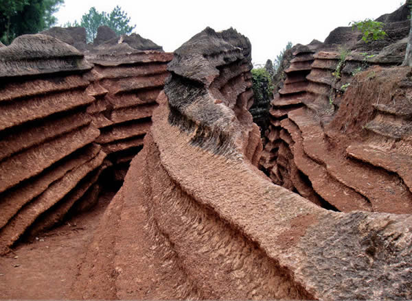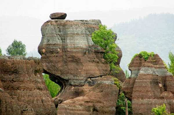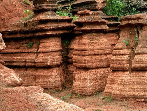 紅石林 告別船工后一切便突然安靜下來(lái),過(guò)山谷的小路沒(méi)有人家,偶爾傳來(lái)幾聲清脆的鳥叫。穿過(guò)幾座隘口,峰回路轉(zhuǎn)后“石林”漸漸露臉,石頭的顏色是由灰白到棕紅,變幻而又使人聯(lián)想。間或一棵參天大樹,或是綠竹三兩棵,則又是另一番景致了。于高于低、于肥于瘦的石林,于石于樹、于濃于淡的色彩,顯得雄奇又雋秀,并透露出一種清靈飄逸。 這些石柱不但顏色各異,而且大小不等。有的高達(dá)七、八米,而有些則像半埋于地下的巨獸骨架。一位村民告訴記者,現(xiàn)在石林沒(méi)有以前壯觀,都長(zhǎng)渣子(灌木)了。原因是由于山頂樹木減少,雨水將泥土帶下山,很多石頭都被埋在土下,后來(lái)這些地方都開(kāi)墾了農(nóng)田,石林也被永久覆蓋。 由于泥土覆蓋,石林被切割成一個(gè)個(gè)小區(qū)域,有些隱蔽在果林中,而有些則像突然從天而降,散落田間。