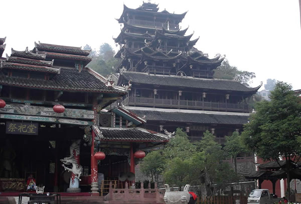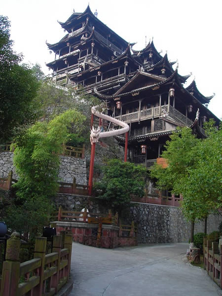 九重天 九重天世襲堂是土家風(fēng)情園的精華和靈魂所在。該建筑由土家民間藝人李宏進(jìn)設(shè)計(jì),依80度陡坡而建,高48米,共9重12層,整個(gè)樓房全部用木栓連接,沒有一顆鐵釘,堪稱土家族建筑史上的奇跡。2002年9 月22日,九重天吊腳樓被載入世界吉尼斯世界紀(jì)錄,認(rèn)定其為目前中國最大、最高、最完美的木質(zhì)結(jié)構(gòu)吊腳樓。2001年4月6日,朱镕基總理視察土家風(fēng)情園時(shí),對(duì)九重天贊不絕口:“一批民間匠人能造出這樣輝煌的吊腳樓,而且還解決了力學(xué)的問題,真是不簡單。”清華大學(xué)著名建筑學(xué)家何重義先生說:“張家界土家風(fēng)情園完全可以和蘇州的園林相媲美。特別是九重天世襲堂,猶如玉宇瓊閣,令人神往!”古人說,天有九野,地有九州,土有九山,山有九寨。古人又把九重叫做天,說天有九重,最上一重是上帝和君主居住的地方,所以我們叫它“九重天”。