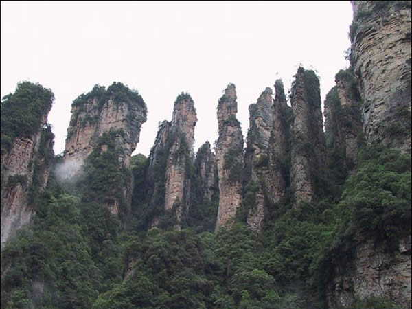 從仙人橋去老屋場(chǎng),但見深谷里密密麻麻羅列上百座石峰,活像一群威武雄壯的將士列隊(duì)聽令,相傳這是向王天子的神兵在聚會(huì)。神話雖不可靠,但石峰如此集中壯觀,在武陵源也屬罕見。我想引用一位美術(shù)大師的話:“豈有此理,莫名其妙,說(shuō)也不信,到此方知”。不看神兵聚會(huì),怎知石峰成林。