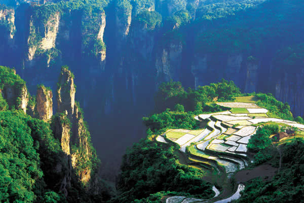 空中田園坐落在天子山莊右側(cè)經(jīng)老虎口、情人路方向兩公里處的土家寨旁,海拔1000余米。它的下面是萬(wàn)丈深淵的幽 谷,幽谷上有高達(dá)數(shù)百米的懸崖峭壁,峭壁上端是一塊有3公頃大的斜坡梯形良田。田園三方峰巒疊翠,林木參天,白云繚繞,活像一幅氣勢(shì)磅礴的山水畫。登上“空中田園”。清風(fēng)拂袖,云霧裹身,如臨仙境,使人有青峰鳴翠鳥,高山響流泉,身在田園里,如上彩云間”之感。