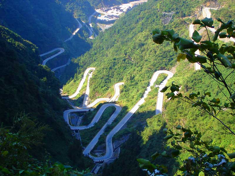 張家界天門山盤山公路有"通天大道"之稱,盤山公路全長10.77公里,海拔從200米急劇提升到1300米,大道兩側(cè)絕壁千仞,空谷幽深,共計99個彎,180度急彎此消彼長,似玉帶環(huán)繞,彎彎緊連,層層迭起,被譽為“天下第一公路奇觀”。