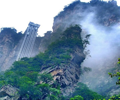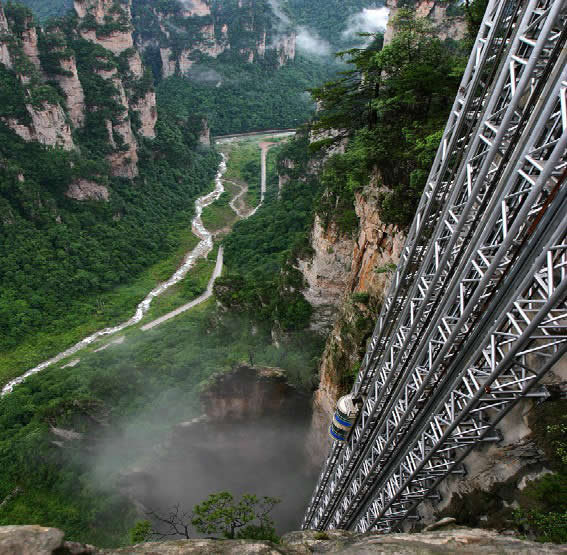 百龍電梯圖片 百龍?zhí)焯輾鈩莼趾,垂直高?35米,運(yùn)行高度326米,由154米山體內(nèi)堅(jiān)井和172米貼山鋼結(jié)構(gòu)井架等組成,采用三臺雙層全暴露觀光電梯并列分體運(yùn)行,每臺次載客50人次,運(yùn)行速度3米/秒,三臺同時(shí)運(yùn)行每小時(shí)往返量達(dá)4000人次。百龍?zhí)焯莸男藿▽?shí)現(xiàn)“山上游,山下住”的目標(biāo),提供了交通保障,將袁家界天下第一橋、迷魂臺、天懸白練以及烏龍寨、楊家界等絕世美景從幕后推向了前臺,并將天子山、袁家界、金鞭溪等精品旅游線路連為一體,解決了多年困擾景區(qū)的交通瓶頸問題。