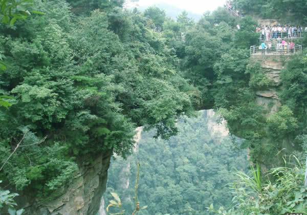 張家界天下第一橋 “天下第一橋”。橋長(zhǎng)20米,寬僅1.5至3米不等,但較平坦,可通行人。橋上蒼松挺拔,橋下云霧蕩漾,萬(wàn)丈深淵。四周懸崖絕壁,水滴飛濺。踏上橋面,使人有凌空御風(fēng)之感。手扶鐵欄桿,仰視,青峰飄渺于云靄繚繞之中;俯瞰,奇峰如筍群,巖壑深谷中陣陣煙嵐泛起,散而復(fù)聚。這里是張家界風(fēng)景一絕,是大自然的一個(gè)奇跡。您看,兩座山峰被一條長(zhǎng)廊連在一起,形成天然橋洞,平時(shí)吞云吐霧,氣勢(shì)壯觀雄奇.橋面寬約兩米,長(zhǎng)20余米,絕對(duì)高度350米。橋上蒼松挺拔,橋邊古藤垂掛,橋下深不可測(cè)。遠(yuǎn)觀此橋,云霧繚繞,橋身若隱若現(xiàn),好似水中倒影一般。走在橋上,只見(jiàn)霧氣蒸騰,松濤呼嘯,石橋好像也顫顫悠悠,晃晃搖搖似的,令人驚心動(dòng)魂。這里是張家界風(fēng)景一絕,是大自然的一個(gè)奇跡。